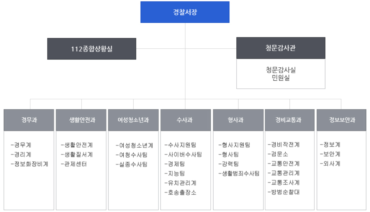 도봉경찰서의 조직도 안내입니다. 도봉경찰서는 경찰서장 아래에 112종합상황실, 청문감사관실, 경무과, 생활안전과, 여성청소년과, 수사과, 형사과, 교통과, 경비과, 정보보안과가 있습니다. 민원실은 청문감사관에 소속되어 있습니다.