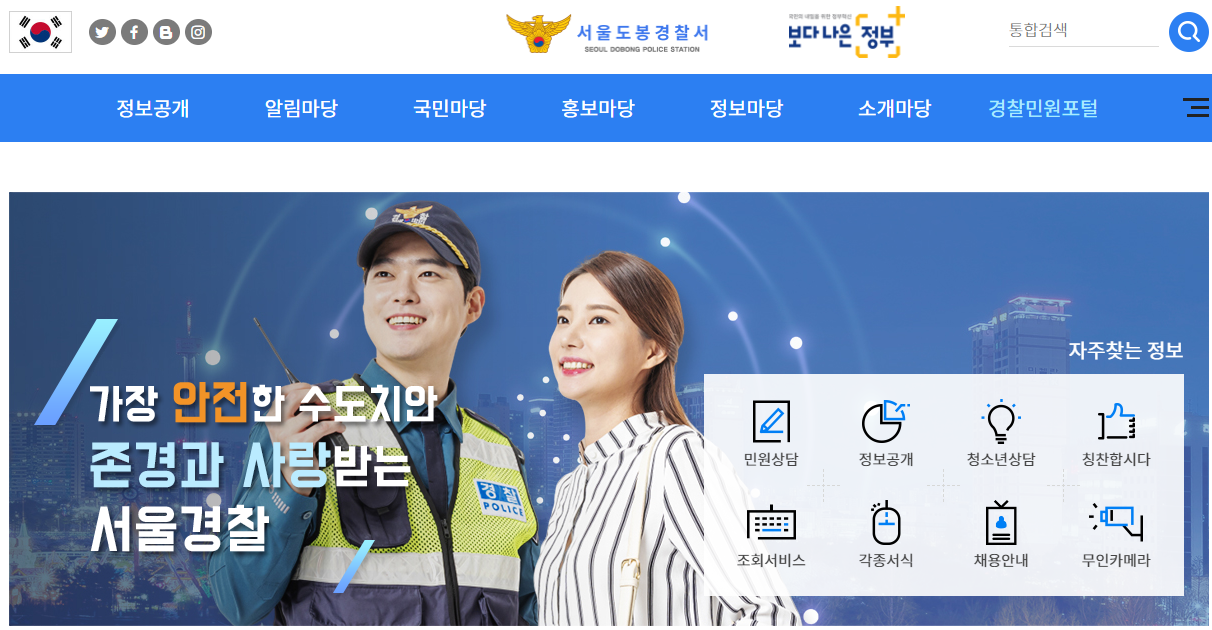 도봉경찰서 홈페이지의 메인화면은 다음과 같습니다. 대부분의 경찰서 홈페이지는 모두 비슷한 구성을 하고 있습니다. 홈페이지의 상단에 주요메뉴가 있는 것을 보실 수 있습니다. 정보공개, 알림마당, 국민마당, 홍보마당, 정보마당, 소개마당입니다.