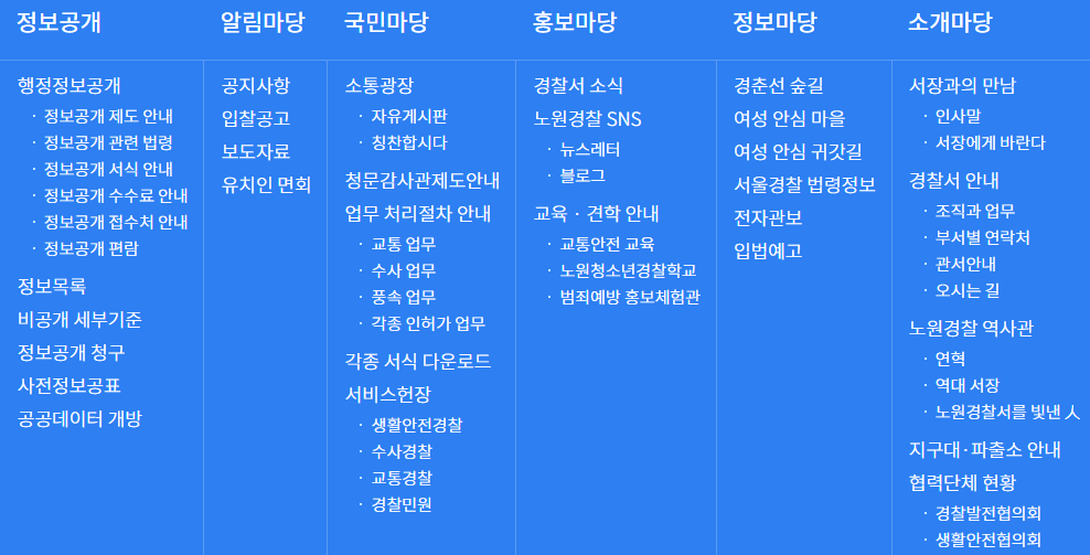 노원경찰서 홈페이지에서 제공하는 전체 메뉴입니다. 6개의 큰 메뉴 안에 세부 서비스 메뉴가 있는 것을 보실 수 있습니다. 많은 분들이 궁금해 하시는 경찰민원업무는 경찰서 홈페이지가 아닌 경찰민원포털 사이트로 접속하시면 간편하게 민원 업무를 보실 수가 있습니다.