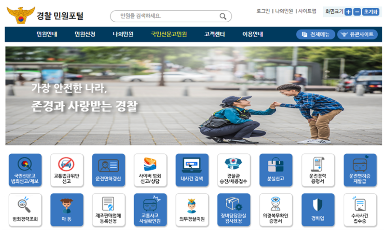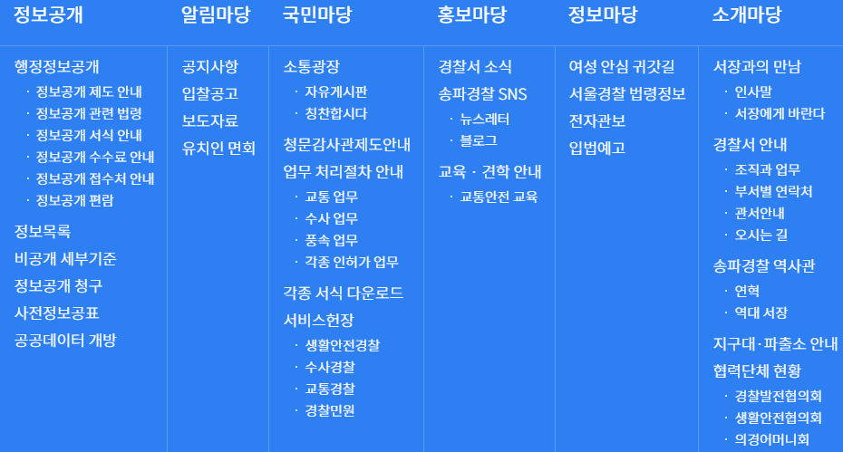 송파경찰서 홈페이지에서 제공하는 전체 메뉴입니다. 6개의 큰 메뉴 안에 세부 서비스 메뉴가 있는 것을 보실 수 있습니다. 많은 분들이 궁금해 하시는 경찰민원업무는 경찰서 홈페이지가 아닌 경찰민원포털 사이트로 접속하시면 간편하게 민원 업무를 보실 수가 있습니다.