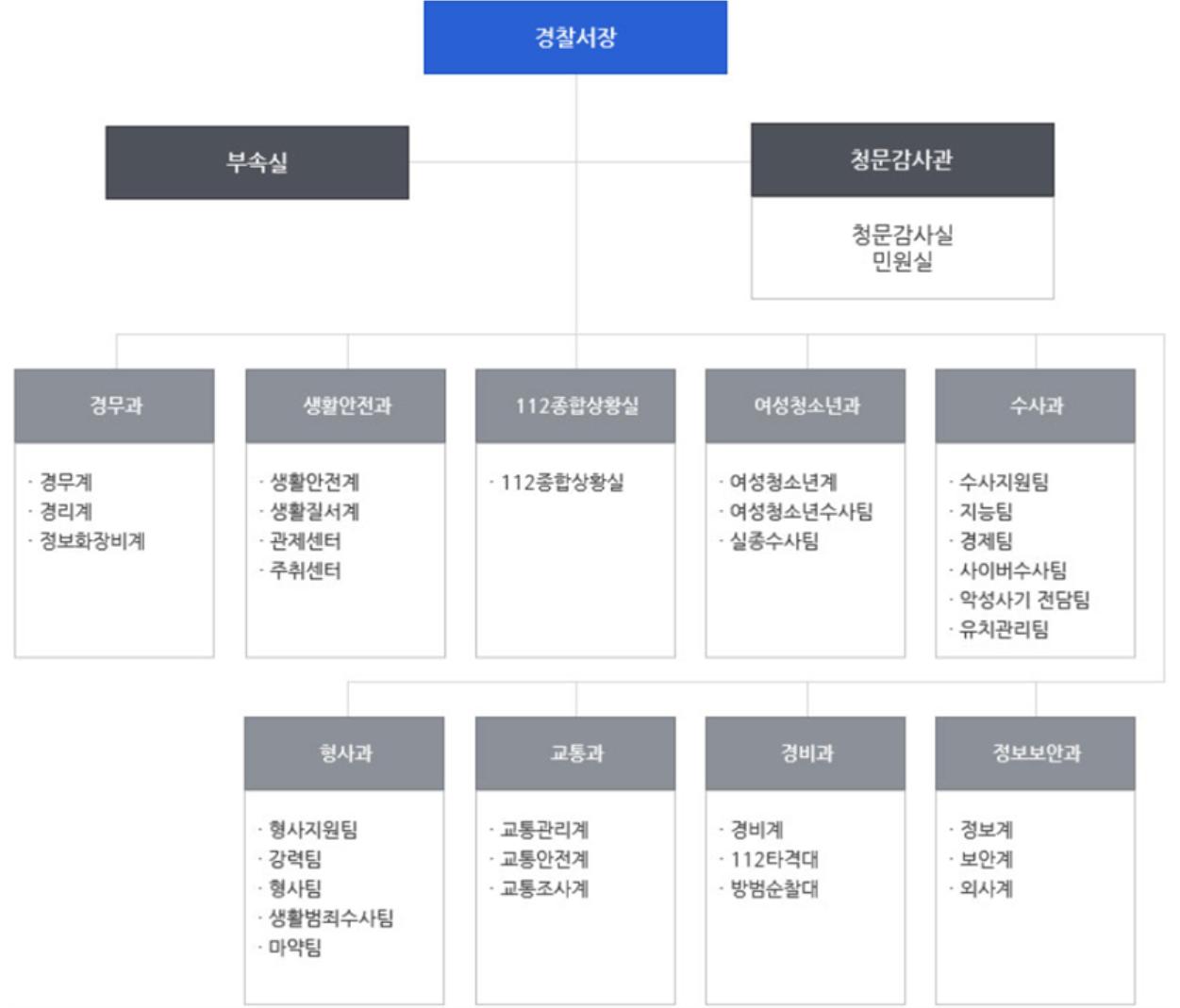 송파경찰서의 조직도 안내입니다. 송파경찰서는 경찰서장 아래에 부속실, 청문감사관실, 경무과, 생활안전과, 112종합상황실, 여성청소년과, 수사과, 형사과, 교통과, 경비과, 정보보안과가 있습니다.