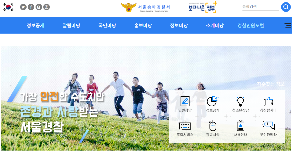 서울특별시 송파구를 관할하고 있는 송파경찰서에 대해서 살펴보겠습니다. 송파경찰서 홈페이지로 접속하기 위해서 포털에서 송파경찰서를 검색합니다. 홈페이지로 이동하시면 원하는 메뉴를 쉽게 찾으실 수가 있습니다. 부서별 전화번호, 조직도, 청사안내, 지구대 및 파출소 안내 등을 간편하게 소개합니다.