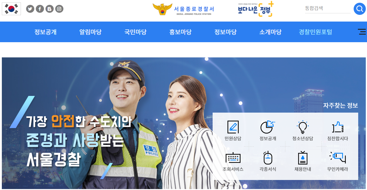 종로경찰서 홈페이지의 메인화면은 다음과 같습니다. 대부분의 경찰서 홈페이지는 모두 비슷한 구성을 하고 있습니다. 홈페이지의 상단에 주요메뉴가 있는 것을 보실 수 있습니다. 정보공개, 알림마당, 국민마당, 홍보마당, 정보마당, 소개마당입니다.