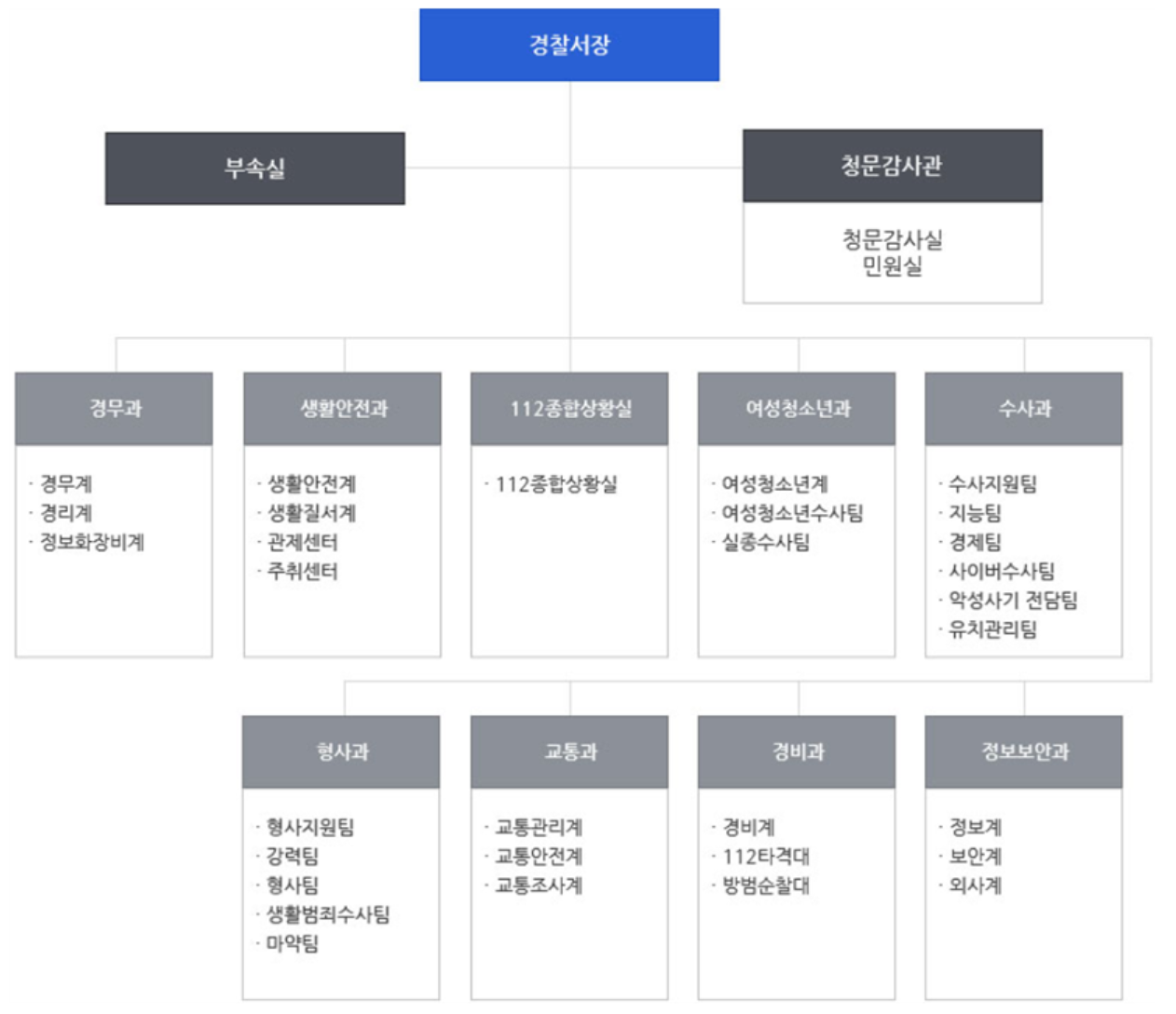 종로경찰서의 조직도 안내입니다. 종로경찰서는 경찰서장 아래에 부속실, 청문감사관실, 경무과, 생활안전과, 112종합상황실, 여성청소년과, 수사과, 형사과, 교통과, 경비과, 정보보안과가 있습니다.