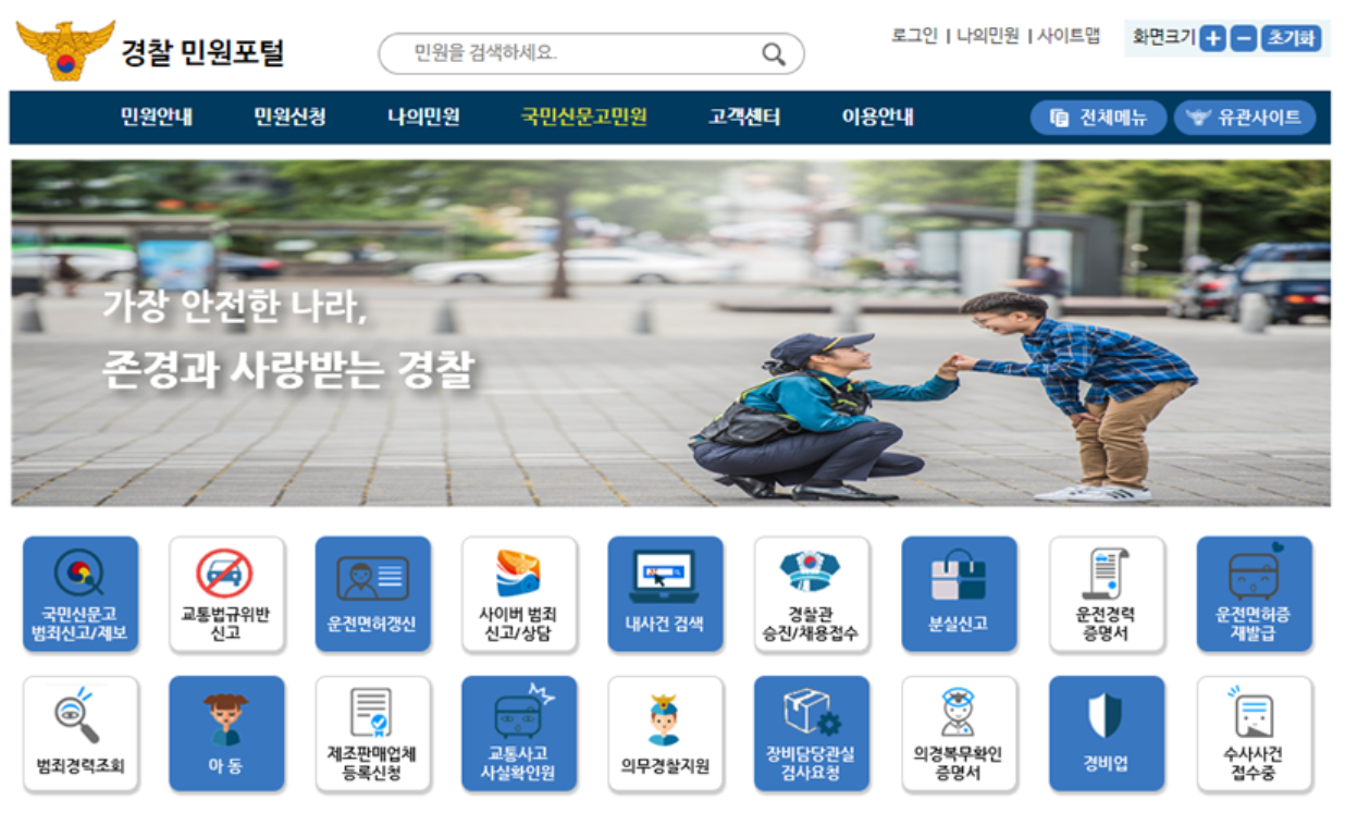 광진경찰서 홈페이지에서 제공하는 전체 메뉴입니다. 6개의 큰 메뉴 안에 세부 서비스 메뉴가 있는 것을 보실 수 있습니다. 많은 분들이 궁금해 하시는 경찰민원업무는 경찰서 홈페이지가 아닌 경찰민원포털 사이트로 접속하시면 간편하게 민원 업무를 보실 수가 있습니다.