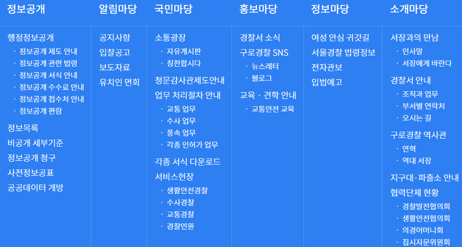 구로경찰서 홈페이지에서 제공하는 전체 메뉴입니다. 6개의 큰 메뉴 안에 세부 서비스 메뉴가 있는 것을 보실 수 있습니다. 많은 분들이 궁금해 하시는 경찰민원업무는 경찰서 홈페이지가 아닌 경찰민원포털 사이트로 접속하시면 간편하게 민원 업무를 보실 수가 있습니다.