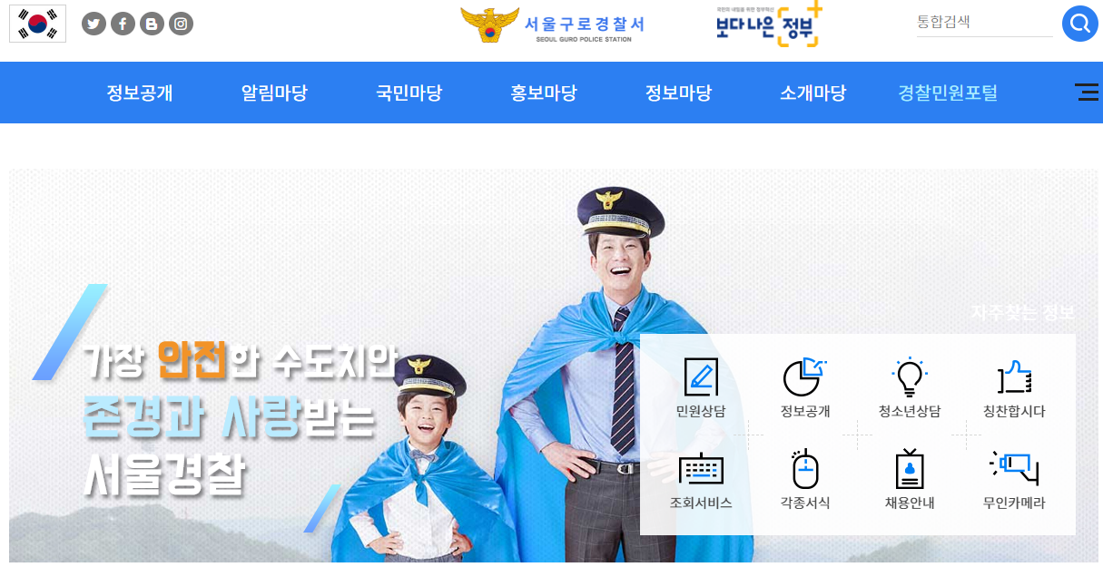 서울특별시 구로구를 관할하고 있는 구로경찰서에 대해서 살펴보겠습니다. 구로경찰서 홈페이지로 접속하기 위해서 포털에서 구로경찰서를 검색합니다. 홈페이지로 이동하시면 원하는 메뉴를 쉽게 찾으실 수가 있습니다. 부서별 전화번호, 조직도, 청사안내, 지구대 및 파출소 안내 등을 간편하게 소개합니다.