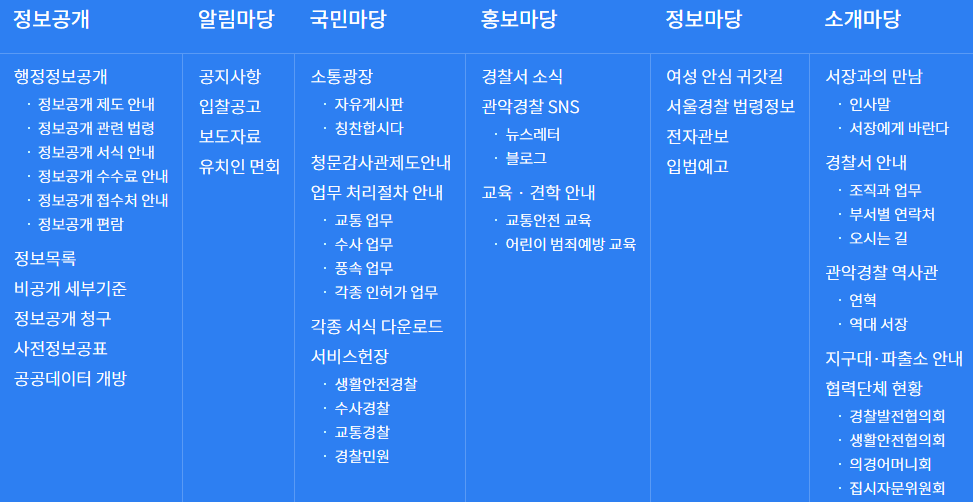 관악경찰서 홈페이지에서 제공하는 전체 메뉴입니다. 6개의 큰 메뉴 안에 세부 서비스 메뉴가 있는 것을 보실 수 있습니다. 많은 분들이 궁금해 하시는 경찰민원업무는 경찰서 홈페이지가 아닌 경찰민원포털 사이트로 접속하시면 간편하게 민원 업무를 보실 수가 있습니다.