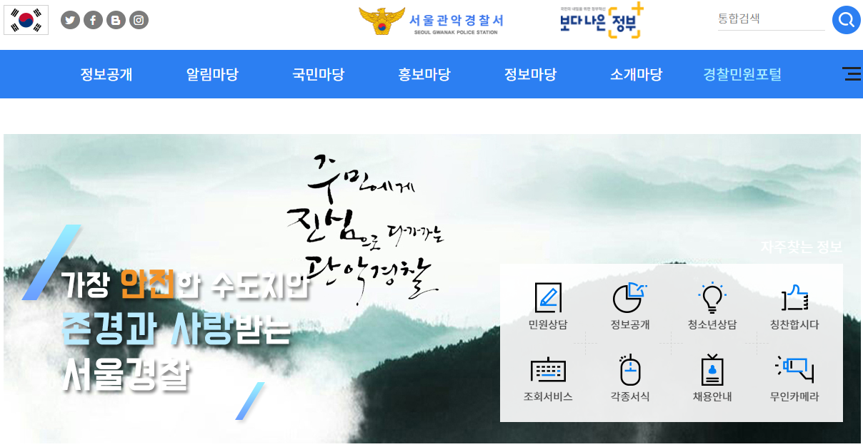 관악경찰서 홈페이지의 메인화면은 다음과 같습니다. 대부분의 경찰서 홈페이지는 모두 비슷한 구성을 하고 있습니다. 홈페이지의 상단에 주요메뉴가 있는 것을 보실 수 있습니다. 정보공개, 알림마당, 국민마당, 홍보마당, 정보마당, 소개마당입니다.