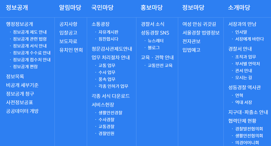 성동경찰서 홈페이지에서 제공하는 전체 메뉴입니다. 6개의 큰 메뉴 안에 세부 서비스 메뉴가 있는 것을 보실 수 있습니다. 많은 분들이 궁금해 하시는 경찰민원업무는 경찰서 홈페이지가 아닌 경찰민원포털 사이트로 접속하시면 간편하게 민원 업무를 보실 수가 있습니다.