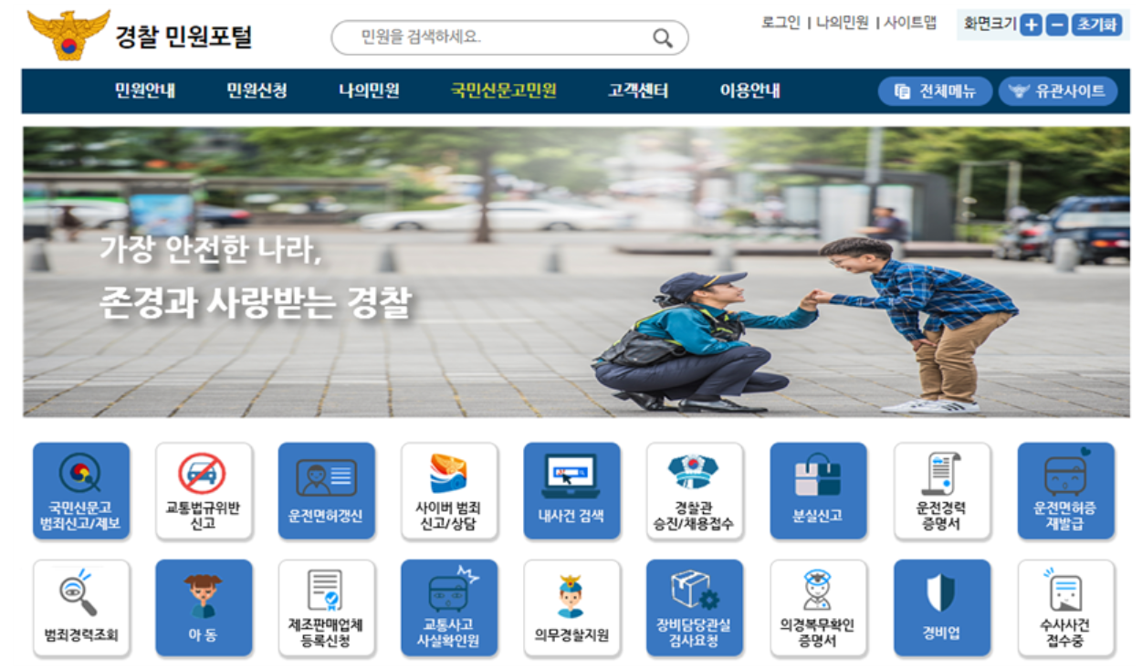 은평경찰서 홈페이지에서 제공하는 전체 메뉴입니다. 6개의 큰 메뉴 안에 세부 서비스 메뉴가 있는 것을 보실 수 있습니다. 많은 분들이 궁금해 하시는 경찰민원업무는 경찰서 홈페이지가 아닌 경찰민원포털 사이트로 접속하시면 간편하게 민원 업무를 보실 수가 있습니다.