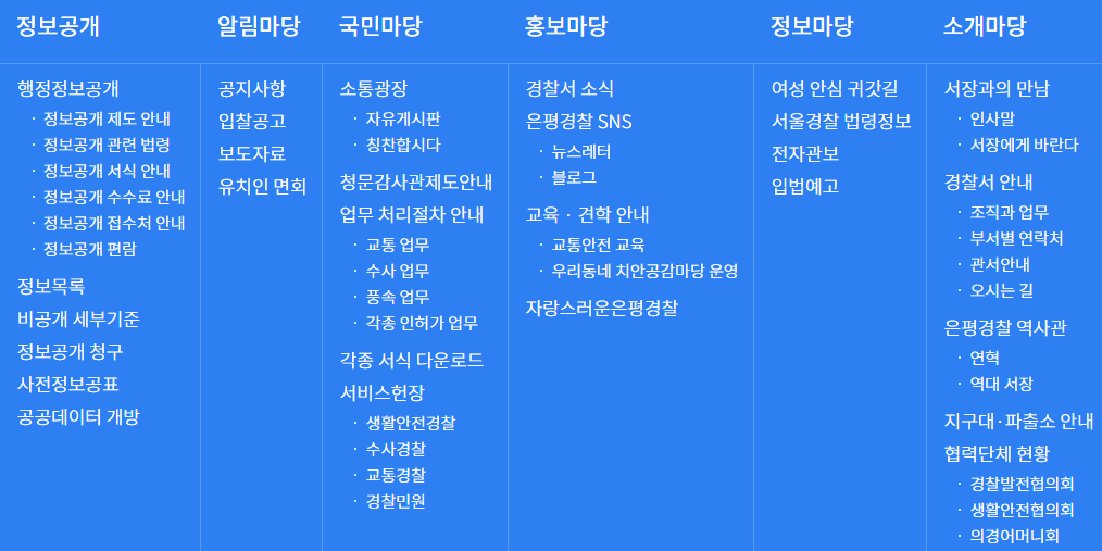 은평경찰서 홈페이지에서 제공하는 전체 메뉴입니다. 6개의 큰 메뉴 안에 세부 서비스 메뉴가 있는 것을 보실 수 있습니다. 많은 분들이 궁금해 하시는 경찰민원업무는 경찰서 홈페이지가 아닌 경찰민원포털 사이트로 접속하시면 간편하게 민원 업무를 보실 수가 있습니다.