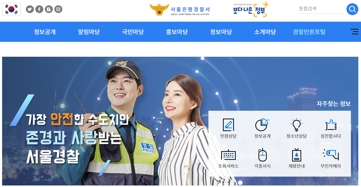 은평경찰서 홈페이지의 메인화면은 다음과 같습니다. 대부분의 경찰서 홈페이지는 모두 비슷한 구성을 하고 있습니다. 홈페이지의 상단에 주요메뉴가 있는 것을 보실 수 있습니다. 정보공개, 알림마당, 국민마당, 홍보마당, 정보마당, 소개마당입니다.