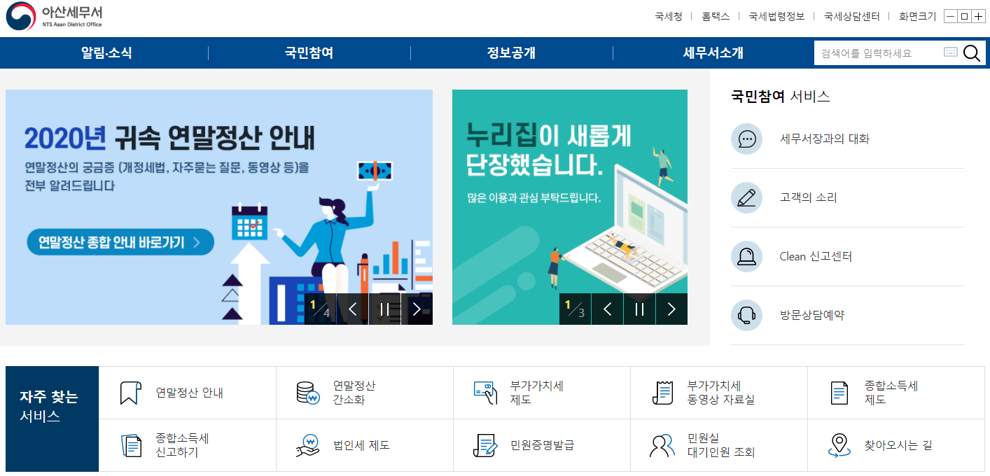 아산세무서를 살펴보기 위해서는 검색엔진에서 아산세무서를 검색해 주시면 간편하게 홈페이지로 접속을 하실 수가 있습니다.