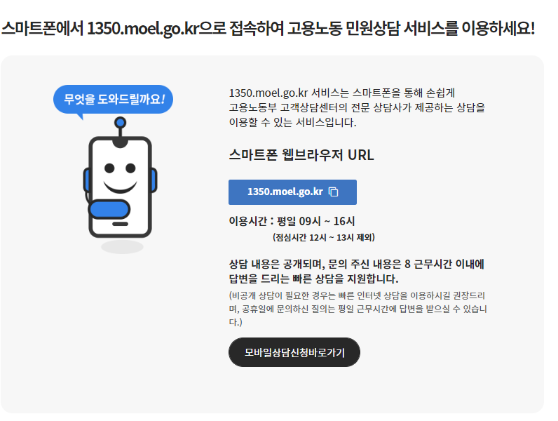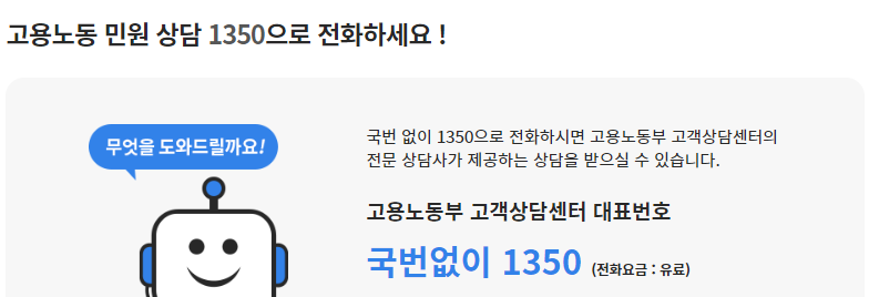 무선전화 혹은 휴대전화로 1350으로 전화하면 고용노동부 전문 상담사가 상담서비스를 제공합니다. 이용시간은 평일 09시~16시입니다. (점심시간 12~13시 제외)